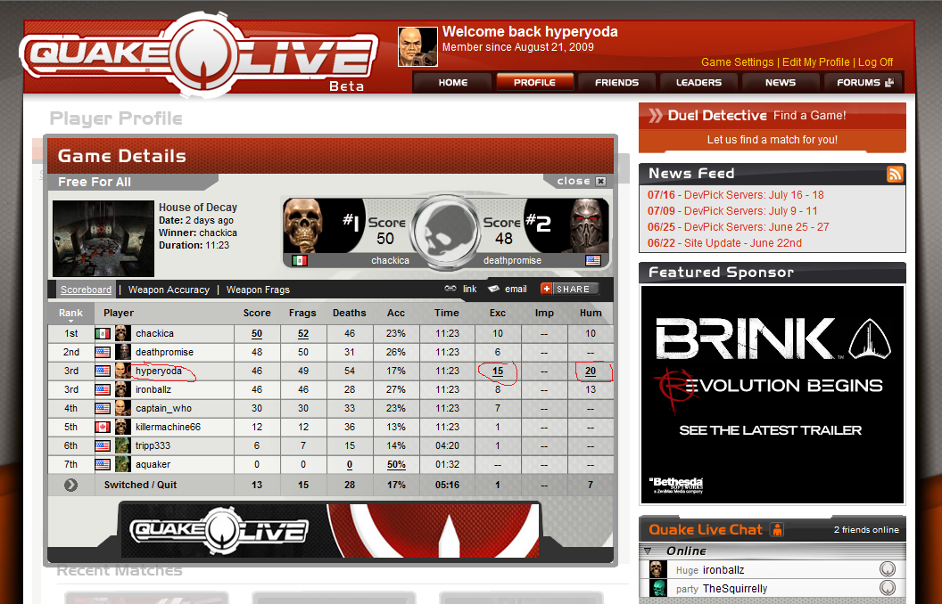 Two days ago I played in a Quake Live match and I scored a total of 35 achievement medals! An all time high for me. 15 Excellent and 20 Humiliations. And I led all players in the match in those two types of medals as well. w00t!