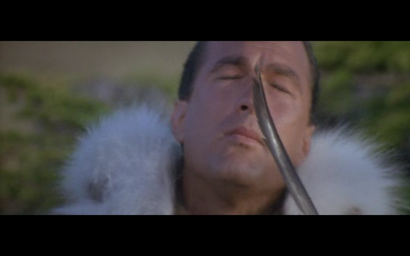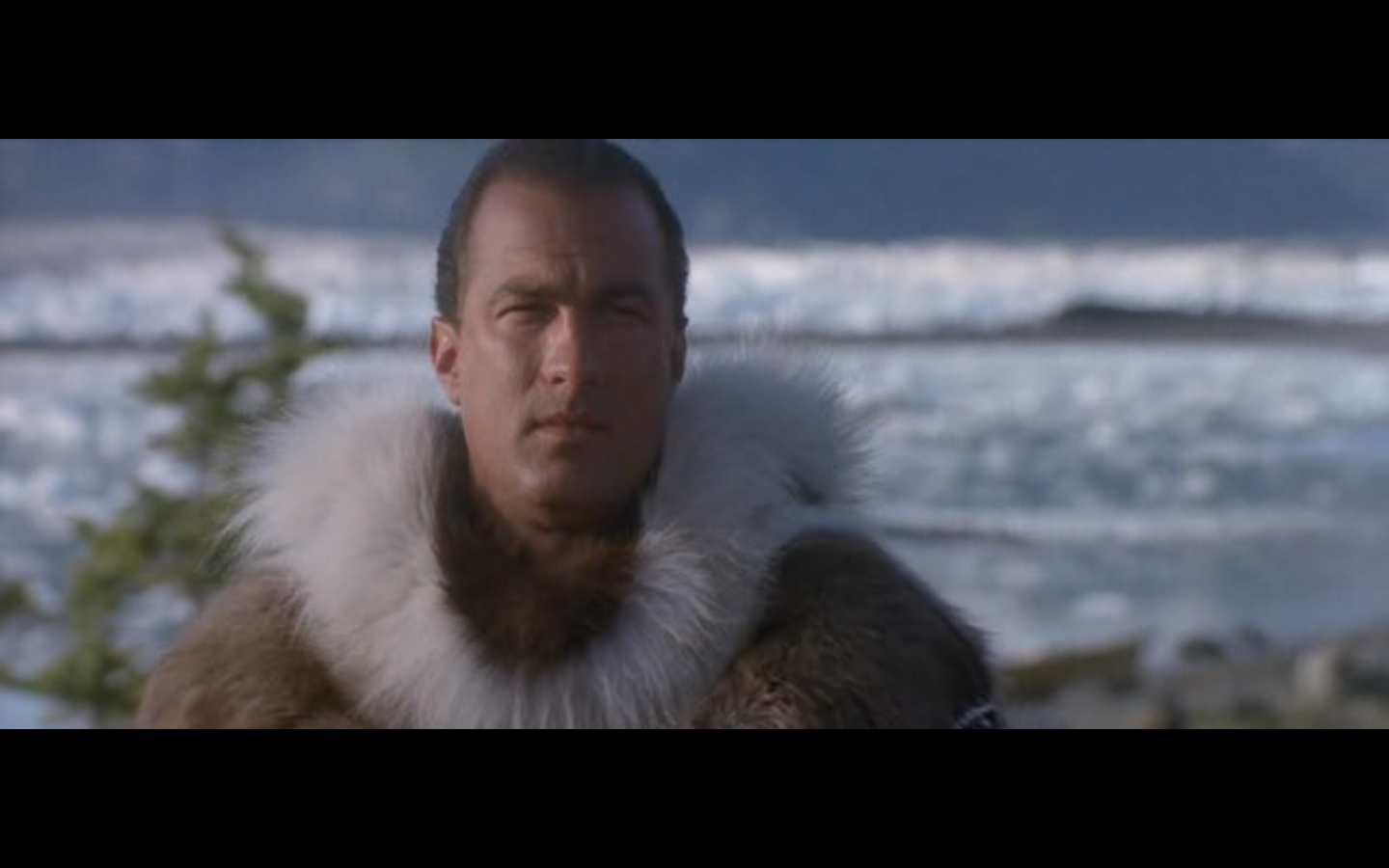 Forrest Taft, Seagal’s character, is touched on the forehead by the Innuit elder and thus enters a vision quest, his spirit guide is the bear. He fights the bear and is thrown into the water, he then goes into a cave and meets an old woman who seems to speak for Grandmother Earth. She tells him all life is in pain and suffering due to the damage man has inflicted upon the earth and that he has been chosen as a spiritual warrior to fight for the Earth. He then emerges from the water, reborn and ready to do battle!