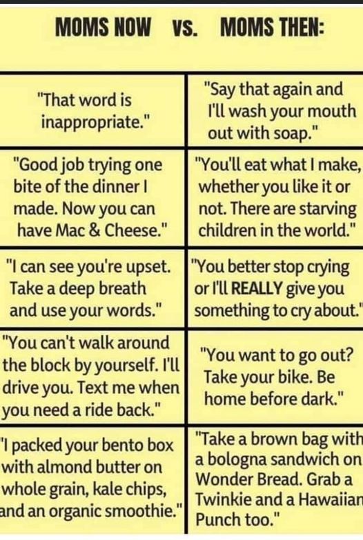 And I see Moms cooking 10 different dinners to satisfy their picky kids! When I was a child you ate what you were served, and you didn’t leave your seat until you ate EVERYTHING! And whining and complaining were not tolerated.