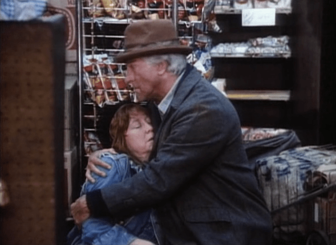 Later that evening, as Wally is performing on the street his friend Margaret, who also lives on the street, approaches. She had a job and her own apartment. She quit her job. Wally asks her why and she says she doesn’t deserve it. She’s nothing. Margaret walks away saying she’s taking the night train. Wally said she thought she’d make it this time. Mark says, “She had her chance.” and Wally says “Ya. She hates herself too much to take it.” Next, they hear a commotion at the nearby liquor store and they arrive to find Margaret shot by the owner for trying to steal. She tells Wally not to get an ambulance, “I’m not worth it.” Wally tells her she’s a wonderful person. Margaret tells Wally to take care of her pumpkin then she dies. Wally is devastated.