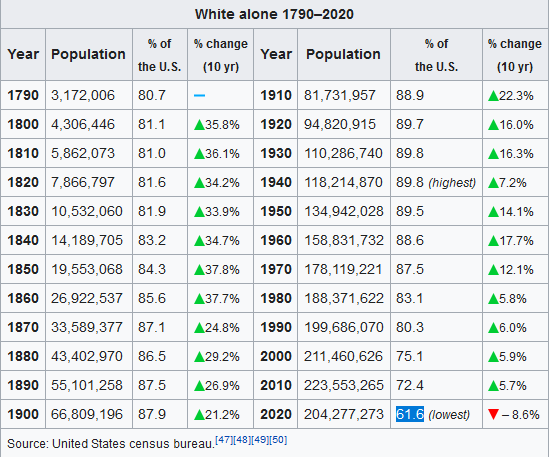 Contrast that with today with the latest data from 2020 where the total white population was 204,277,273 and only 61.6% of the total population was white!