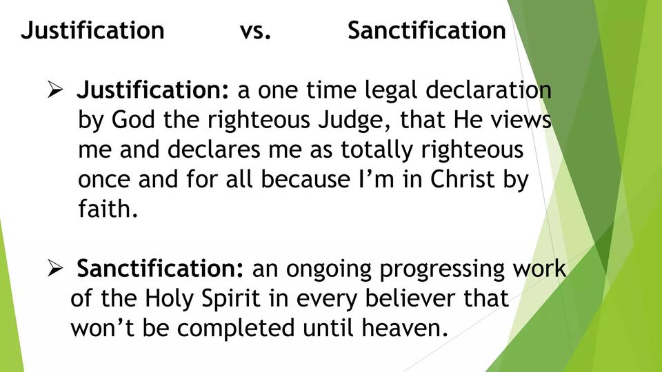 1 Cor. 6:11; 1 Cor. 1:30; Rom. 4:6, 8; Ezek. 36:27; Rom. 3:24-25; Rom. 6:6, 14; Rom. 8:33-34; 1 John 2:12-14; Heb. 5:12-14; 1 John 1:8, 10; 2 Cor. 7:1; Phil. 3:12-14.